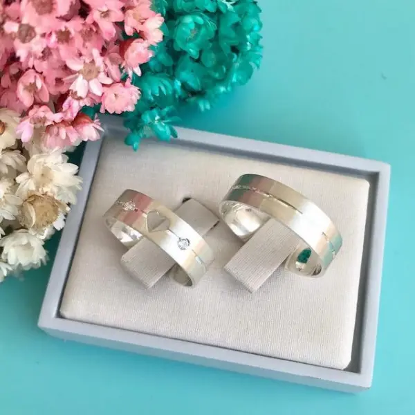 Alianças na prata 925, com detalhes de coração vazado na aliança feminina.