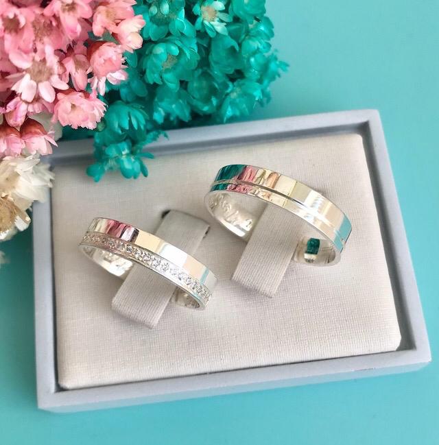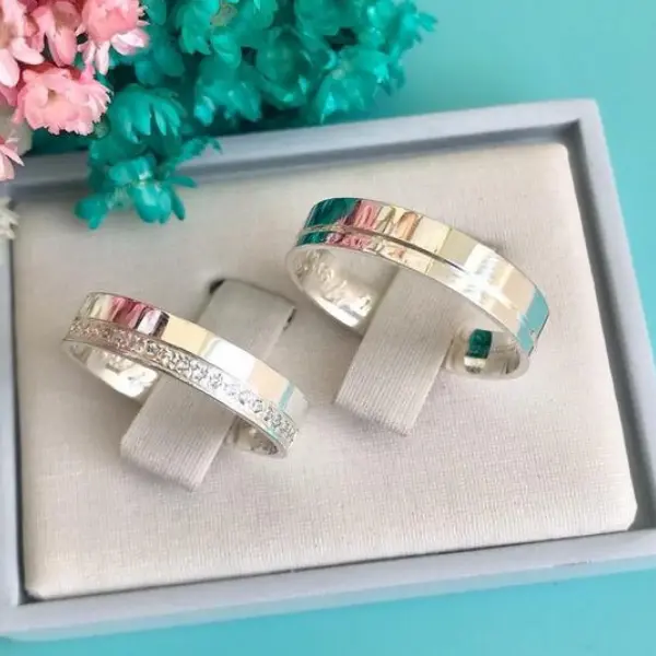 Alianças na prata 925, a aliança feminina é cravejada com zircônias na parte da frente.