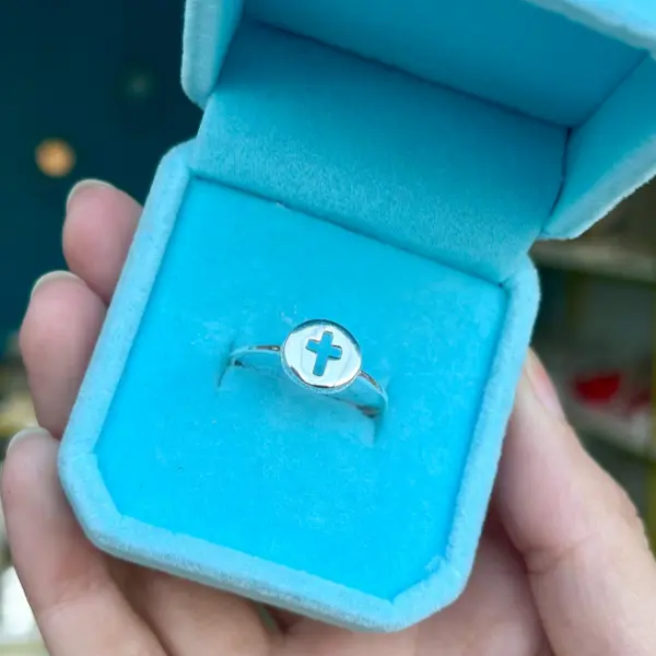 Anel de prata 925 com topo redondo e detalhe de cruz vazada. Um anel simples e cheio de significado.