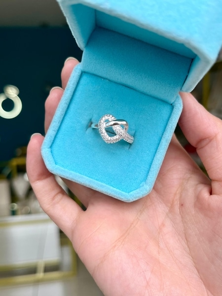 Anel todo na prata 925 com cravação de pedras de zircônias, adicionando brilho e um toque de sofisticação. Uma joia que se destaca pela sua forma única e pelo simbolismo associado aos laços e uniões.