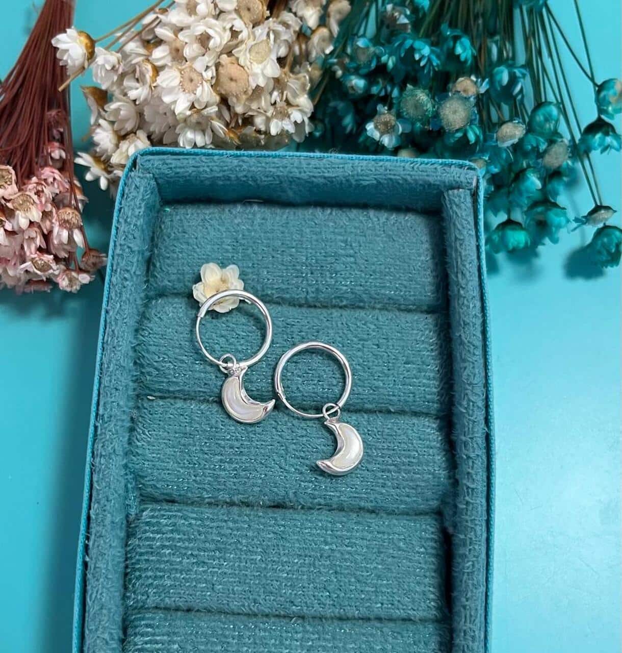 Argolinha de encaixe com pingente de lua, toda na prata 925.