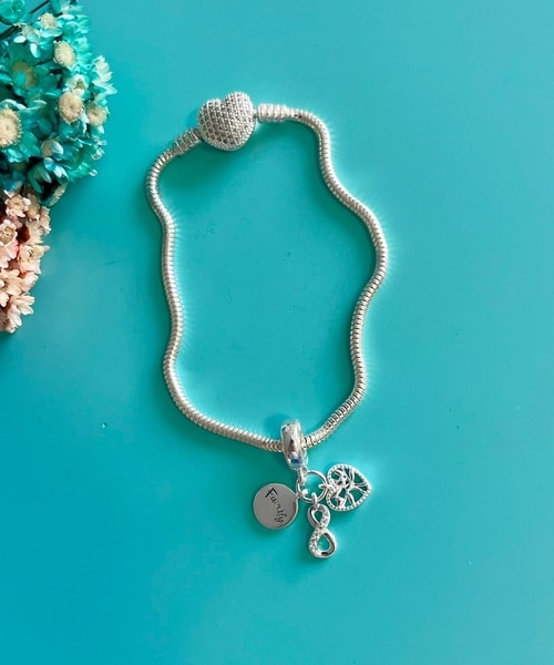 Berloque família todo na prata 925 com detalhes cravejados, o berloque conta com 3 pingentes, um coração, um símbolo do infinito cravejado e uma medalha escrito Family( Família em inglês).