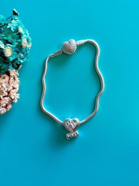 Berloque separador todo na prata 925 com detalhes cravejados com zircônias rosa claro. Separador em formato de coração com patinha de cachorro cravejada e osso pendurado.