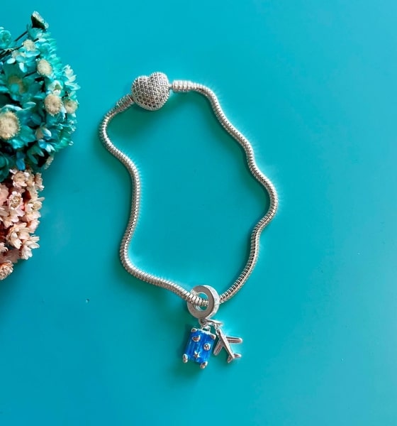 Berloque todo na prata 925, com detalhes cravejados com zircônias e resina azul. Esse berloque tem 2 pingentes, uma mala de viagem e um avião.