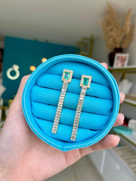 Os brincos são semijoias douradas elegantes e longas, caracterizadas por um desing retangular com uma combinação de pedras verdes e zircônias. Apresentam um formato retangular alongado e pendente, com um estilo sofisticado. No topo, destaca-se uma pedra de cor verde que é contornada por pequenas zircônias incolores, que adicionam brilho e realçam a pedra central. Abaixo da pedra verde, uma cascata de zircônias incolores em lapidação retangular alongada completa o design. As semijoias possuem 1 ano de garantia em sua cor.