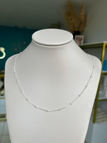 Colar todo na prata 925, com detalhes de bolinhas. É um colar atemporal, pois esse modelo está sempre na moda.
