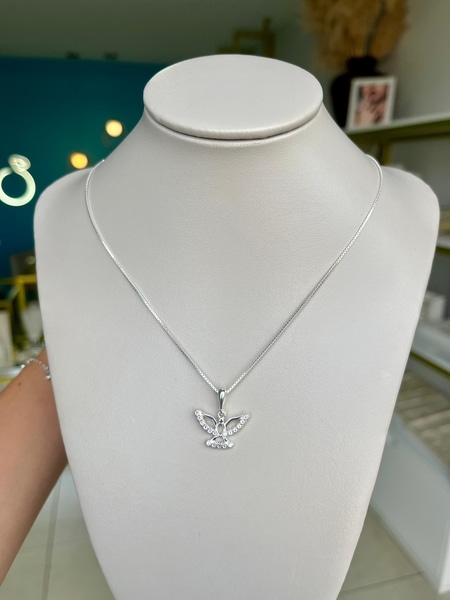 Colar Espírito Santo todo na prata 925 com detalhes cravejados com zircônias. A corrente tem 45 cm.
