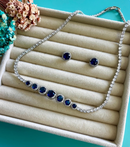 A gargantilha apresenta uma linha contínua de pedras, com cristais azuis no centro e zircônias cercando-as e estendendo-se pela corrente do colar. O brinco comtém um cristal azul no centro e mini zircônias em volta. Peças como essas são consideradas sofisticadas e atemporais, ideais para ocasiões especiais ou para adicionar um toque de elegância ao dia a dia. As semijoias possuem garantia de 1 ano em sua cor.