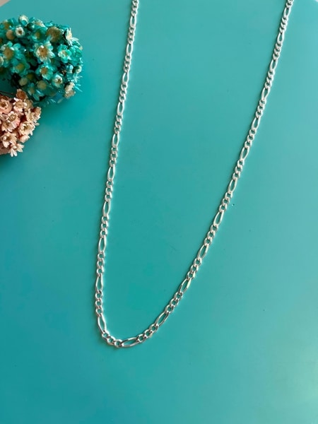 Corrente toda na prata 925. Essa corrente possui um padrão de elos alternados, onde geralmente três elos menores e mais finos são seguidos por um elo maior e mais alongado, criando um visual distinto e elegante. Essa corrente tem 60 cm.