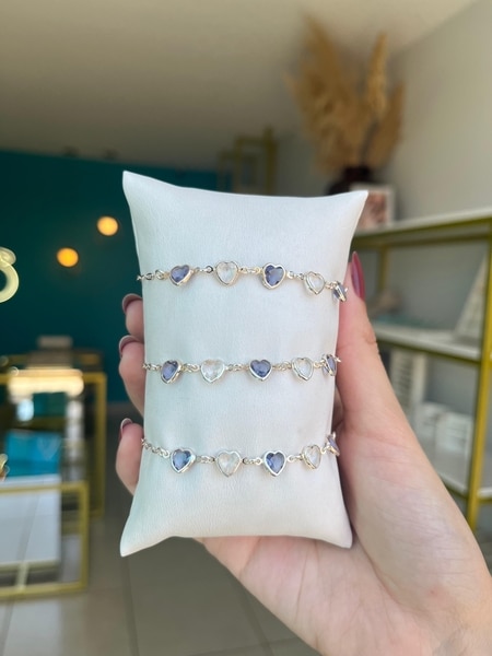 Pulseira toda na prata 925, com cristais em forma de coração branco e lilás.