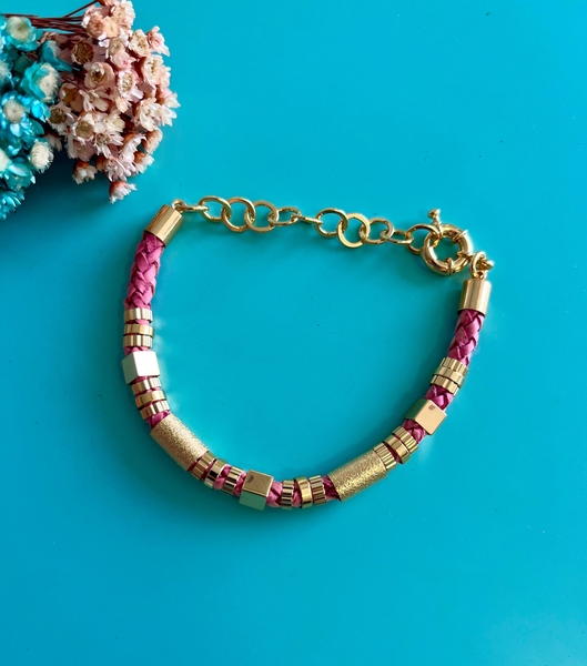 A pulseira é composta por uma parte trançada, em couro na cor rosa, intercalada com contas ou cilindros metálicos dourados. Possui um fecho tipo lagosta, comum em muitos tipos de pulseiras para garantir segurança e facilidade de uso. Classificada como uma pulseira de estilo misto, que incorpora diferentes materiais e texturas para criar um design único. As semijoias possuem garantia de 1 ano em sua cor.