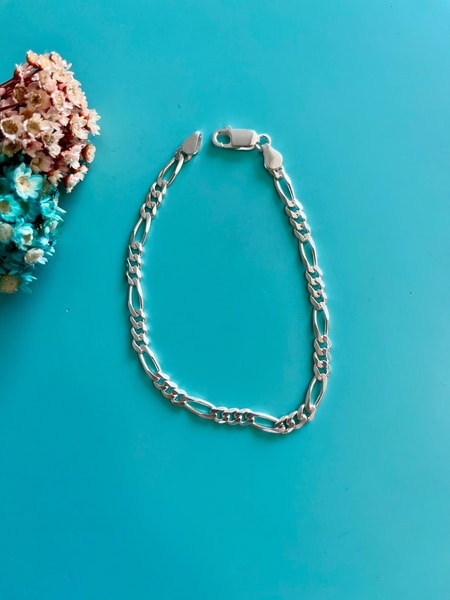 Pulseira toda na prata 925. Este tipo de pulseira é caracterizado por um padrão de três elos menores seguidos por um elo alongado, repetindo-se sequencialmente. Essa pulseira tem 21 cm.