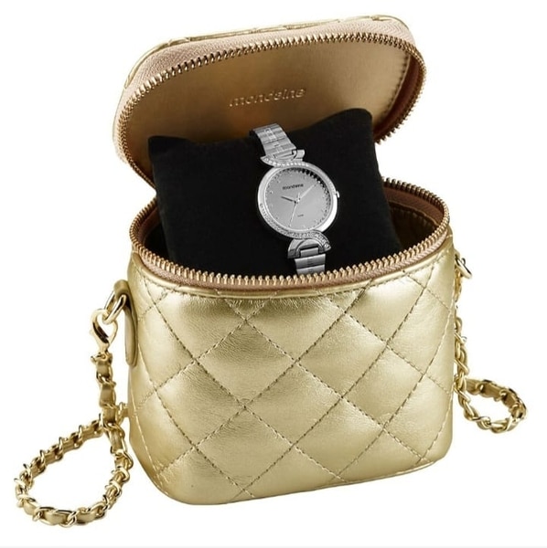 Este relógio com mostrador espelhado e cristais tanto na marcação quanto na caixa adiciona brilho ao pulso. Com uma caixa de metal de 3cm de diâmetro e uma pulseira fina em aço estilo bracelete, combina elegância e leveza. Seu design versátil se adapta confortavelmente a todos os tamanhos de pulso. Acompanha uma linda bag dourada, tornando-se o presente perfeito.