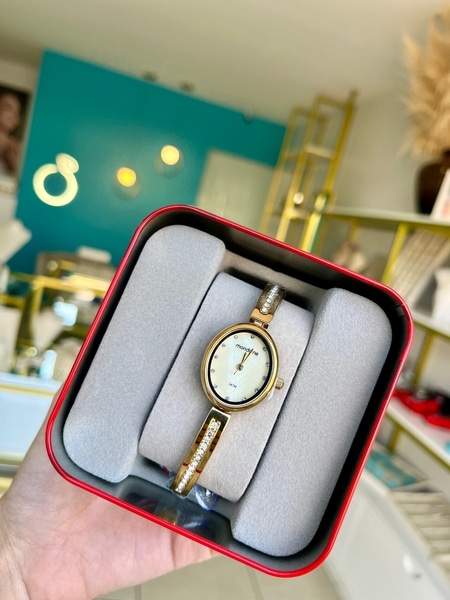 Elegante relógio feminino com caixa oval pequena, mostrador em madrepérola e marcação de horas adornada com cristais. A pulseira rígida também é decorada com cristais cravejados, complementando o estilo sofisticado. Com uma caixa de 2,3 cm de diâmetro, este relógio analógico ostenta uma elegante folheação dourada, conferindo-lhe um toque de luxo. Ideal para pulsos finos e delicados, é um modelo clássico. Seu fecho tipo joalheria garante praticidade e segurança.