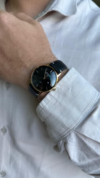 Relógio clássico e elegante, combina caixa em aço dourado com mostrador preto e pulseira de couro legítimo na mesma tonalidade.