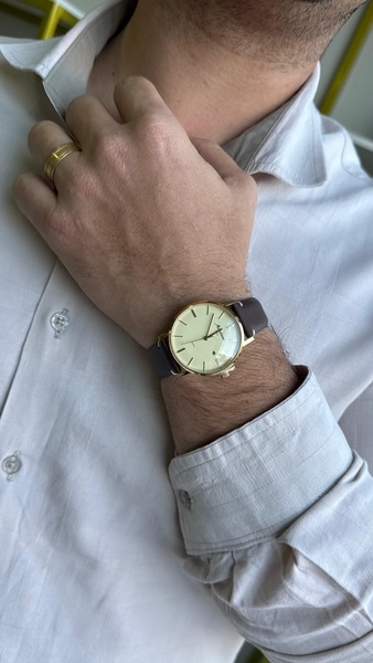 Caixa em aço redondo, mostrador champagne com index completo e vidro Dome levemente abaulado, que remete aos modelos vintage.