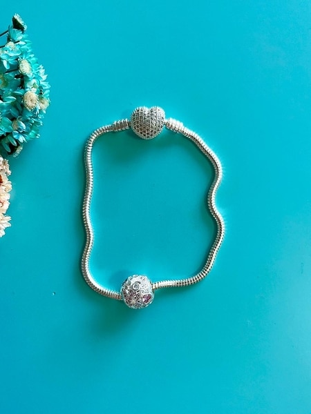 Berloque separador redondo todo na prata 925 com detalhes de coração e ossinhos cravejados.